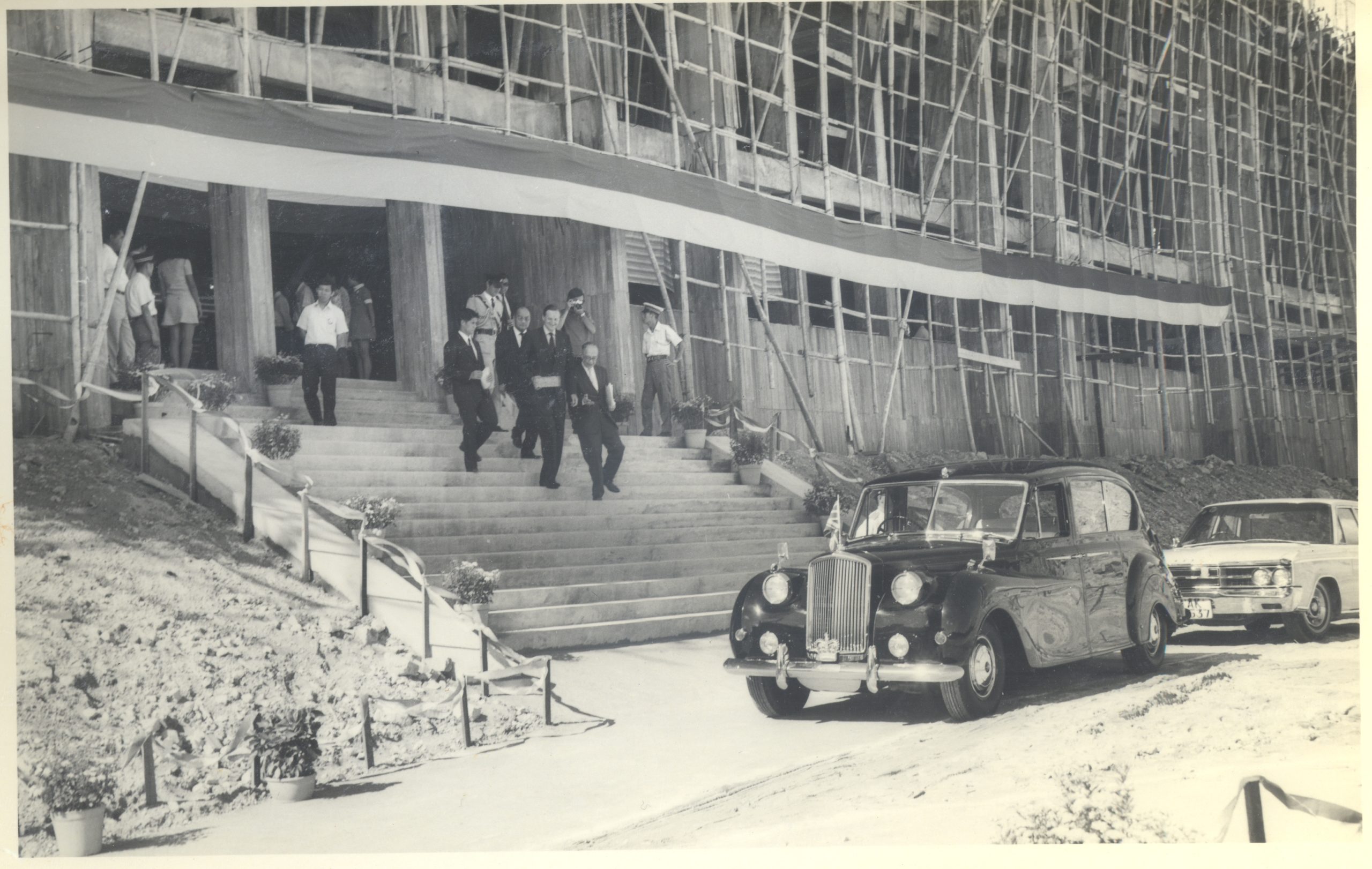The laying of the foundation stone of New Asia College’s Shatin campus took place on June 30, 1972, with Governor Sir Murray MacLehose, Chancellor of CUHK, officiating. In his opening address, President Y. P. Mei of New Asia College welcomed the Governor on the College’s behalf. After reminiscing New Asia’s founding ideals and purposes, as well as the community’s support (the Yale-in-China Association in particular) for New Asia, President Mei expressed gratitude to the Hong Kong Government for financing New Asia’s new campus, “The construction cost of these five principal buildings, not counting the site, amounts to more than 13 million dollars. We humbly hope our performance will justify the generosity shown us.”